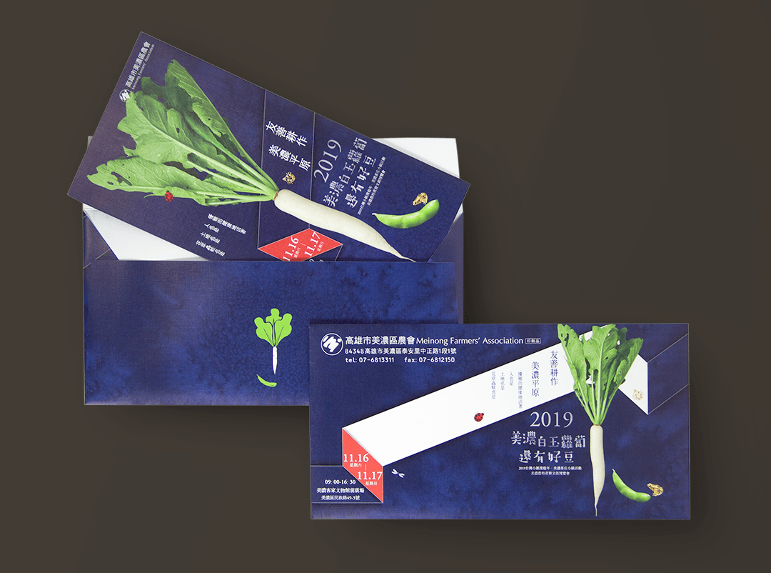 「友善耕作,美濃平原」:優雅而健康地活著,人也是,土地也是,花草蟲蛙也是。 美濃白玉蘿蔔還有好豆季為一年一度重要盛典,帶來人流、促進美濃地區觀光及周邊產業發展。首次將舞台移至田間,搭配氣勢磅礡非洲鼓表演歌頌大地,訴說人與大自然和平共處,強調邁向友善耕作。錯落兩側大型台灣花布球更增添色彩、田區後方設置大型橫躺白玉蘿蔔、冬季裡做農作物等視覺藝術,提供親子遊玩、拍照同樂。 整體活動主視覺使用美濃客家藍衫的主色調,以竹子搭建日式暖簾入口主意象,揭開整個蘿蔔季序幕,將農民平日曬蘿蔔網架移至會場,一覽真實日曬及原始烘乾過程,真實食農教育已然展開。精心挑選在地特色農民市集,讓來訪民眾感受這片土地的蓬勃生氣。