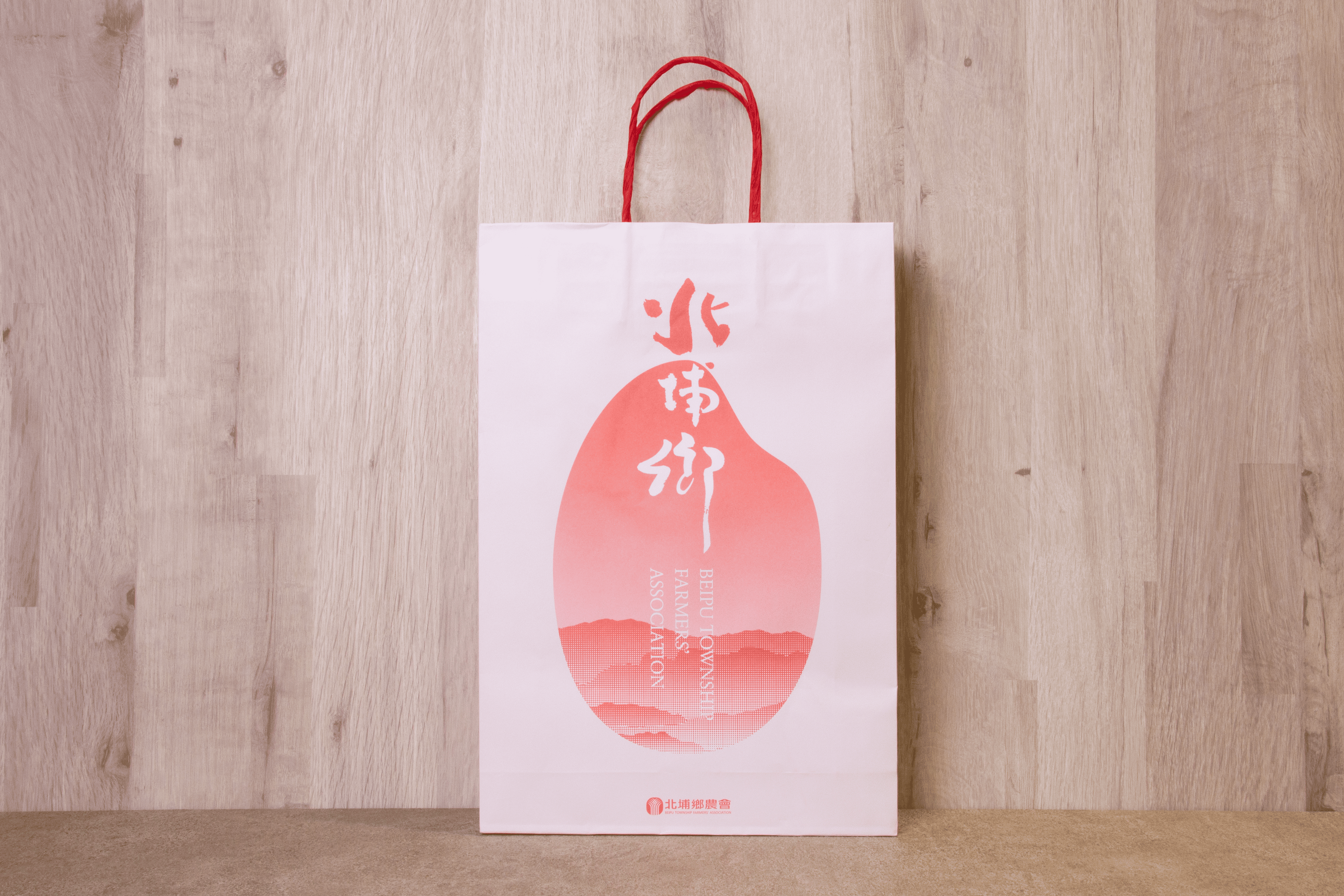 紙袋設計融入北埔鄉的稻田風光,以旭日東昇的溫暖色調展現如詩如畫的田園意境,並搭配上溫暖詩詞:「故人故事故里,時光幻化小鎮浪漫。」讓每位前來北埔鄉農會的顧客都能將北埔的美景帶回家收藏,不只購買了一份農會優質產品,更收穫了溫暖的鄉情與時光的餘韻。