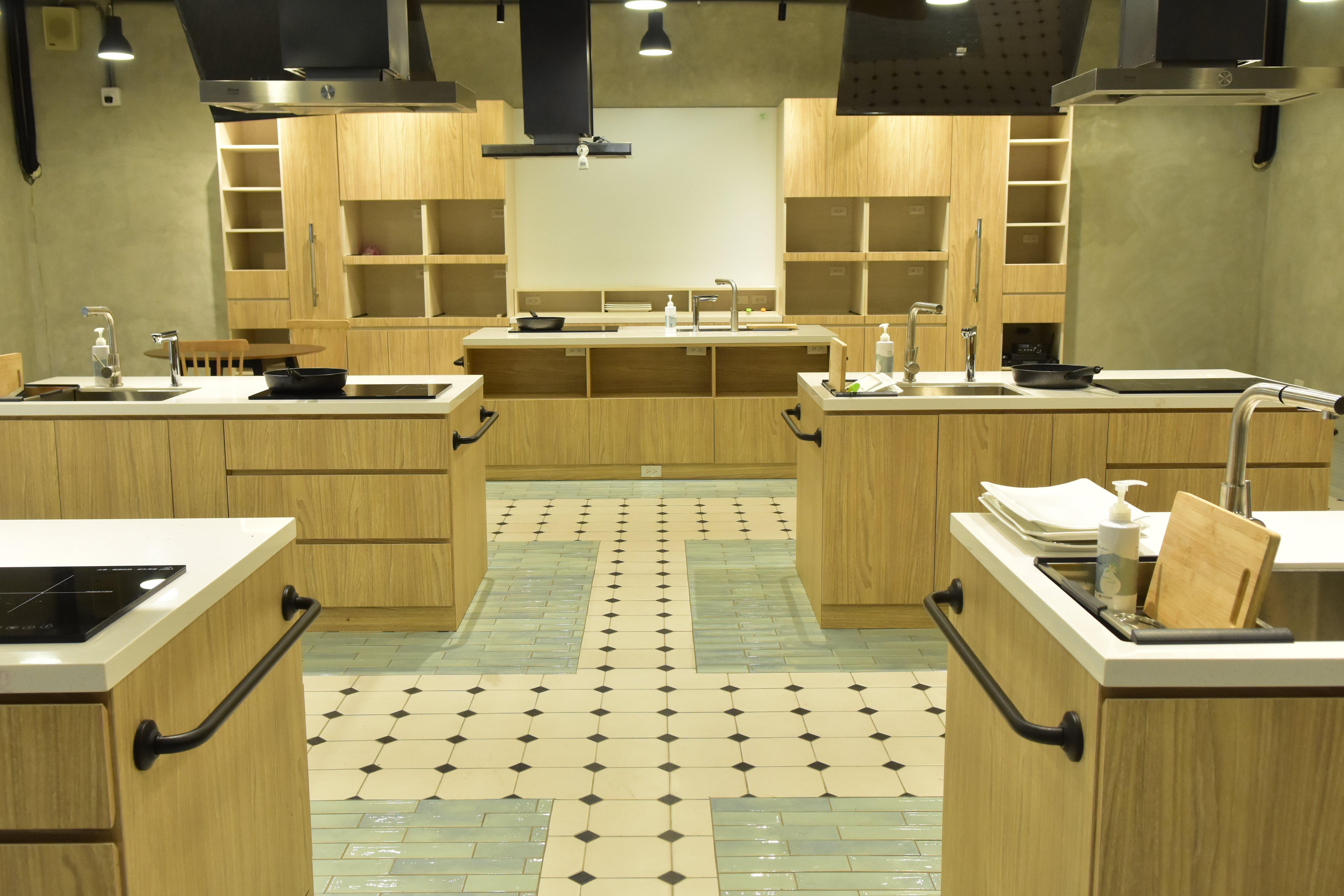 全新的家政教室,採用簡約風格空搭配全面升級的設備與整潔明亮的環境,營造出如家般的舒適感。廚具設備選用木紋材質,散發溫暖自然的氛圍。這裡不僅提供了專業功能,更成為學習與料理的理想空間。